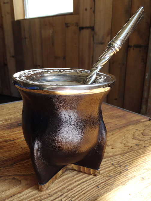 Calabaza natural, cuero vacuno, virola de alpaca cincelado con base.
