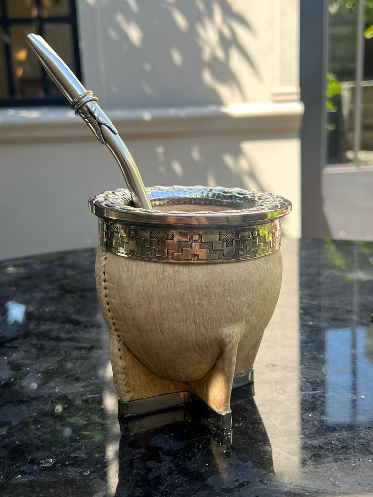 Imperial artesanal revestido en cuero crudo natural, con delicadas terminaciones en alpaca cincelada que realzan su estilo tradicional. Cuenta con base de alpaca, que brinda mayor estabilidad, resistencia y un acabado elegante. Su interior es de calabaza natural seleccionada, ideal para mantener el sabor auténtico del mate.